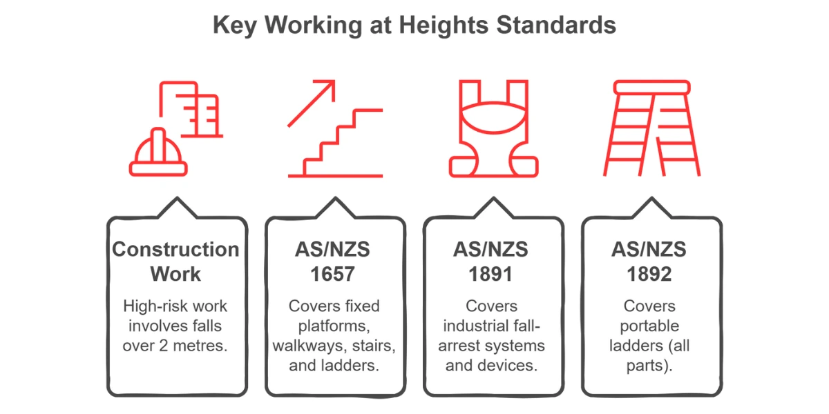For working at heights, several critical Australian Standards provide detailed guidance and requirements. Understanding and adhering to these specific Australian Standards is not just about ticking a box - it's fundamental to creating a truly safe working environment when operating at heights.